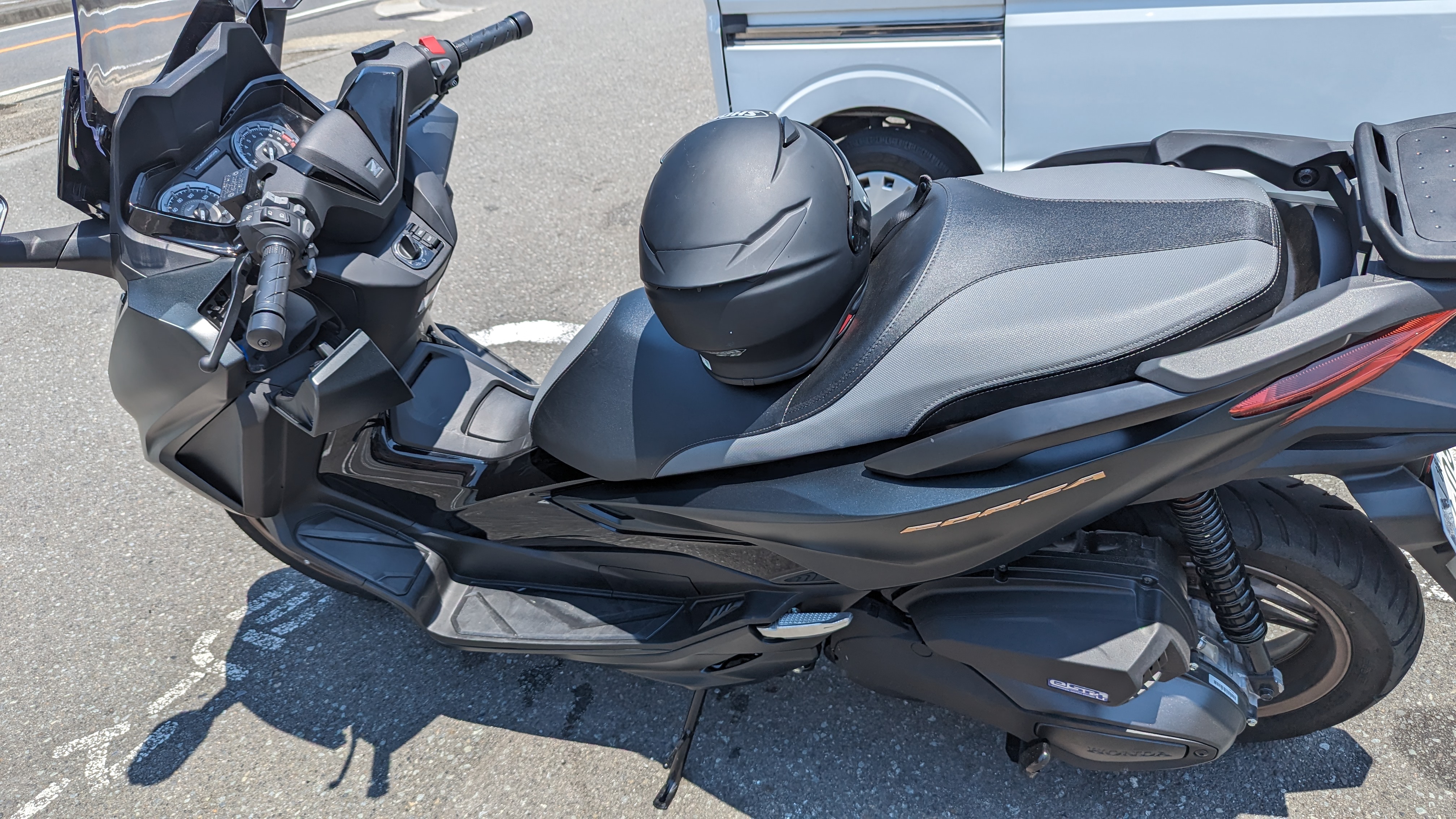 FORZAの方が2トーンのシートの印象が目立っていました。XMAXが幅広なシートと書きましたが、FORZAも幅広でシート高が125ccのスクーターと同じでも